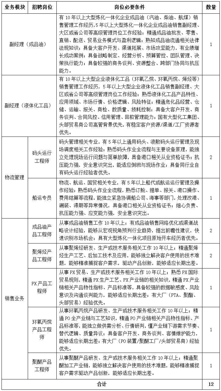 1.副经理岗位:原则上年龄不超过45周岁,全日制本科及以上学历,石油化工或市场营销专业优先,工作经验丰富及有突出业绩的可适当放宽年龄和学历要求;物流管理模块岗位:原则上年龄不超过45周岁,全日制大专及以上学历,具备良好的英语读写能力者优先;销售业务模块岗位:原则上年龄不超过45周岁,全日制本科及以上学历,具备良好的英语读写能力者优先。